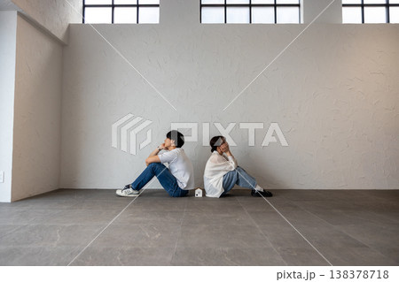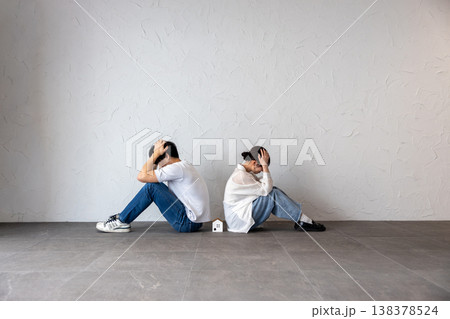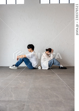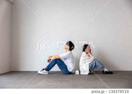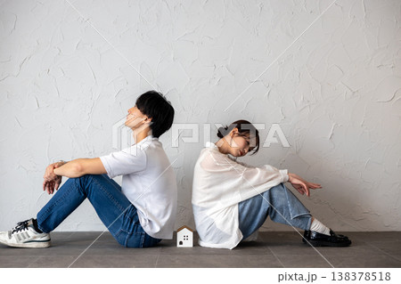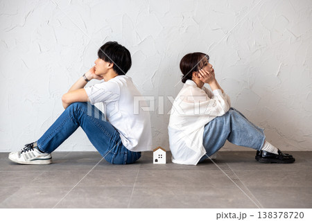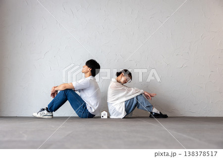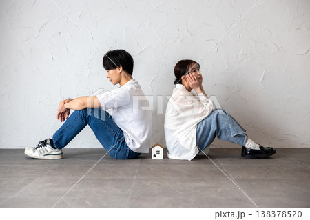 家のオブジェを真ん中にして背中合わせに座って困って考え込んでいる若い男女
