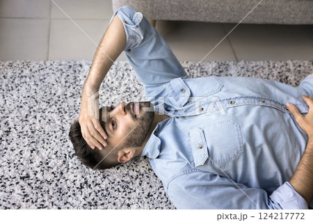 Exhausted man male rubbing temples to cure headache problem suffering from tension migraine stress