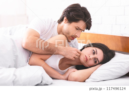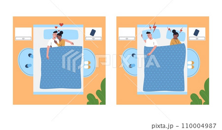 Man and woman lying in bed. Couple cuddling and arguing. Family relationship. People conflict. Happy lovers. Bedroom top view. Sexual embrace. Quarreling sad persons. Vector concept
