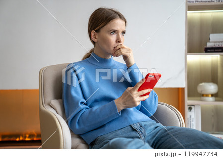Confused busy woman holding smartphone, thinking over work and financial tasks. Financial problems
