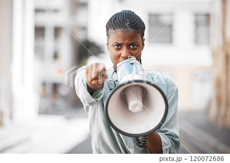 Women are already strong. Shot of a young woman screaming into a loud speaker while protesting in the city.