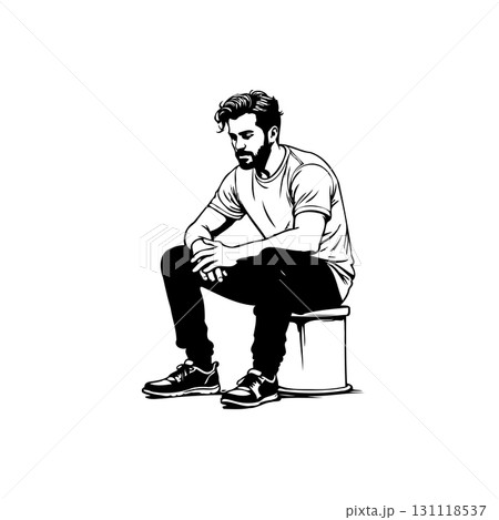 Sad unhappy frustrated Asian man sitting alone in city street, feeling bad, annoyed, grief, problem