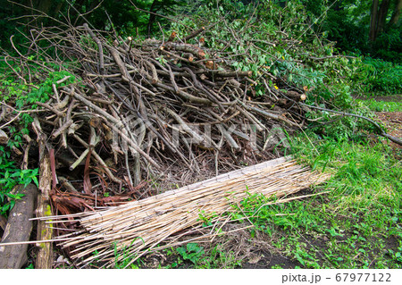 集められ積まれた大量の小枝と枯れ葉