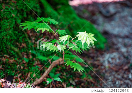 初夏の高清水トレイルの植物 遊歩道脇のハウチワカエデの幼木 岡山県苫田郡鏡野町