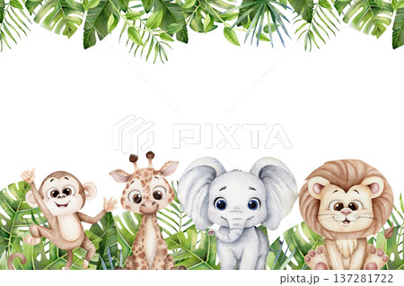 Cute watercolor jungle animal frame with baby monkey, giraffe, elephant and lion among tropical leaves on white background, hand painted illustration with copy space for kids invitations and decor