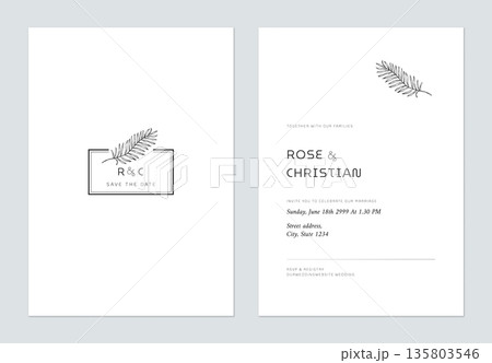 Minimal floral wedding invitation card template design, vintage palm leaves line art ink drawing decorated on rectangle frame