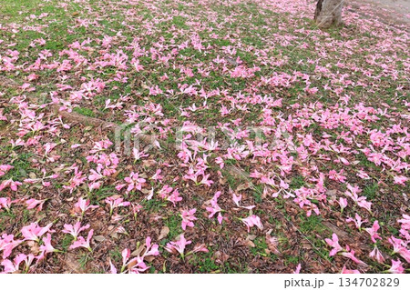 自然 植物 トックリキワタ、地面を覆う落下した花が美しい。十二月、那覇市の公園で