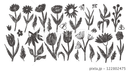 Hand drawn flowers and leaves set. Charcoal linocut poppy, tulip, daisy doodle monochrome. Floral aster and marguerite kids chalk style shape. Vector black pencil illustration on white background