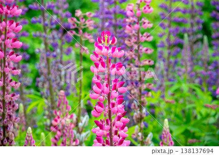 ピンク色と赤色のルピナス