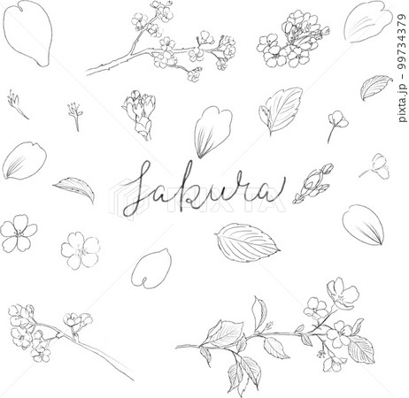 桜の花と枝と葉っぱの手書きの水彩画イラストパーツ