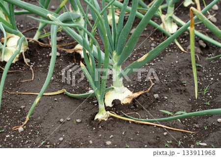 石のある畑でのタマネギ栽培 玉ねぎ畑 (5月) 家庭菜園