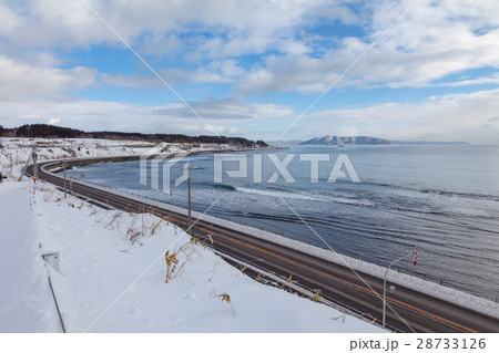 冬の国道228号と津軽海峡