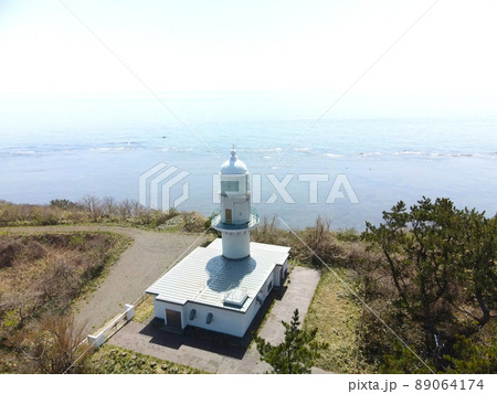 春の北海道北斗市で葛登支岬灯台の風景を空撮