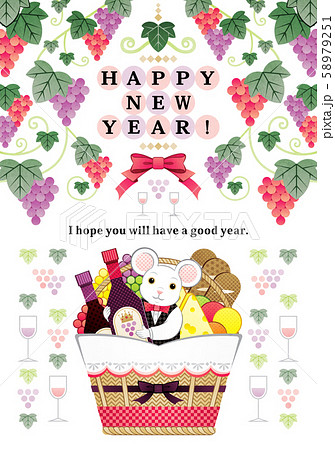2020年・令和2年・2032年子年イラスト年賀状デザイン「鼠と葡萄とワインの食べ物バスケット」
