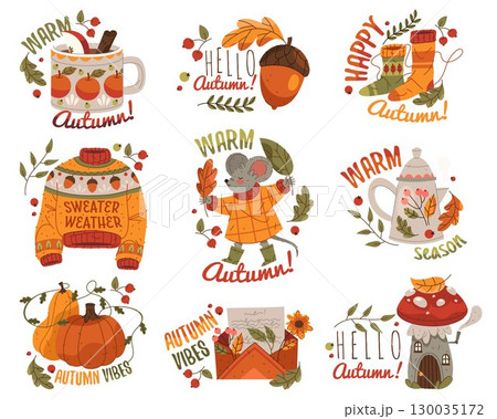 Set of autumn sticker or fall poster. Vector seasonal sign for September holiday or harvest celebration, thanksgiving and Halloween. Forest leaves and pumpkin, mouse, wine, mushroom, letter on placard