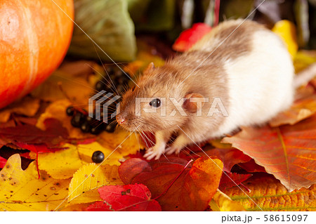 Rat sitting on colorful autumn leaves