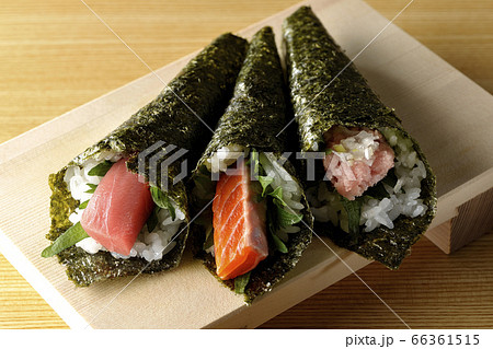 寿司下駄の上に置かれた3種の手巻き寿司