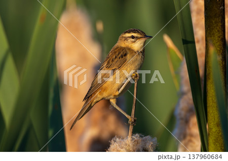 Sedge warbler perching on a cattail reed in wetland