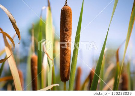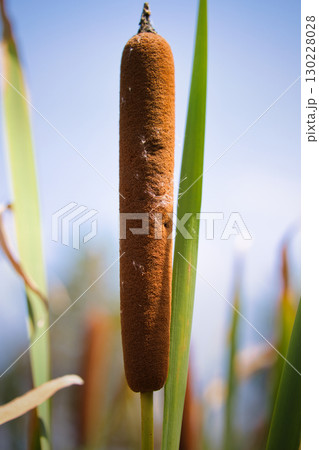 湿地に自生する茶色く実ったガマの穂