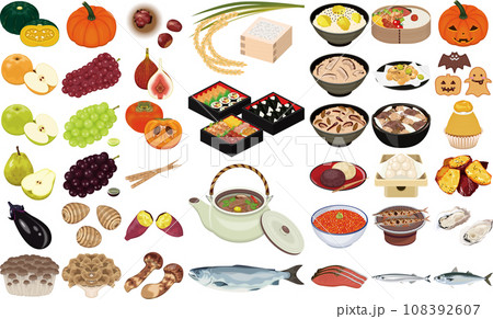 秋の味覚・料理のイラスト①(新米、さんま、松茸、焼きいも、ぶどう)