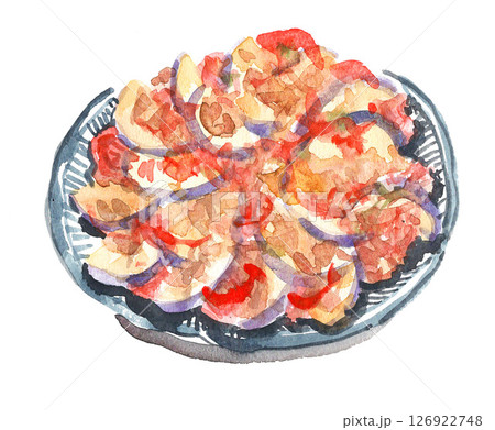 水彩で描いた茄子とトマトの豚バラ重ね蒸し2564pix7