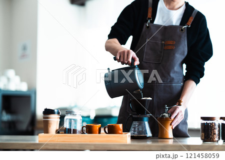 ドリップケトルでコーヒーを淹れる若い女性店員 顔無し