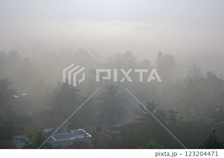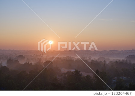 インド_ヤシの木と朝もやに注ぐ太陽光の風景