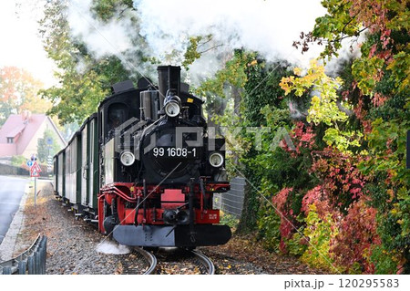 ドイツ ドレスデン近郊 ヴァイセリッツ渓谷鉄道の狭軌蒸気機関車 シュミーデベルクの街を行く