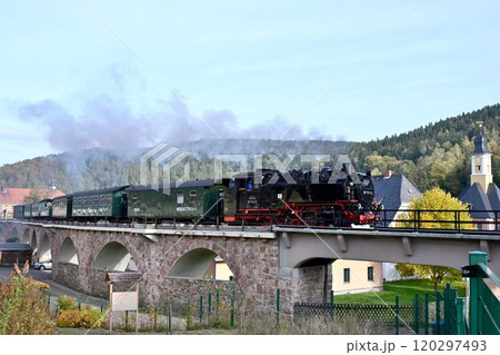 ドレスデン近郊 ヴァイセリッツ渓谷鉄道の狭軌蒸気機関車 マルター駅 石造りアーチ橋を行く