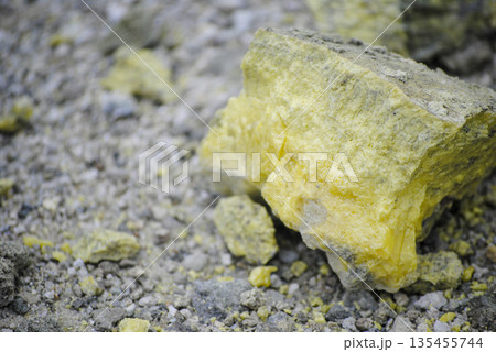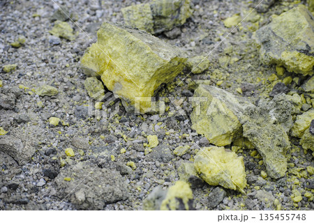 Macro shot of vibrant yellow sulfur crystals on a fumarole field. Natural mineral deposits on the slopes of Kuril Islands.