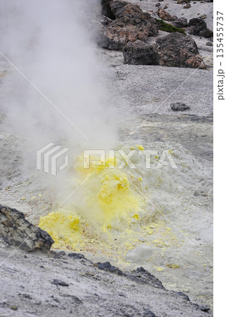 Geothermal fumarole field on a volcano slope in the Kuril Islands. Hot steam vents and bright yellow sulfur deposits.