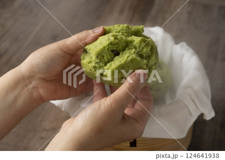 セイロで蒸したよもぎ蒸しパンを手で持つ