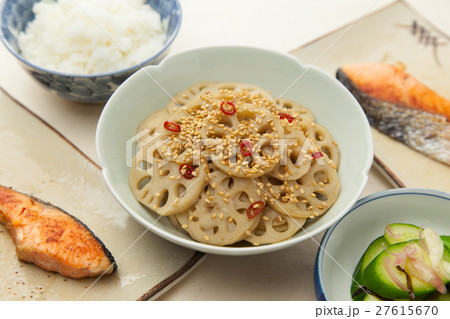 レンコンのきんぴらと塩鮭、ご飯、漬物