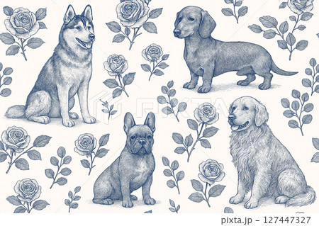 ハスキーやフレンチブルが咲くバラとともに描かれた線画