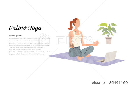 ベクターイラスト素材:オンラインヨガを楽しむ若い女性