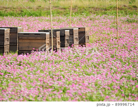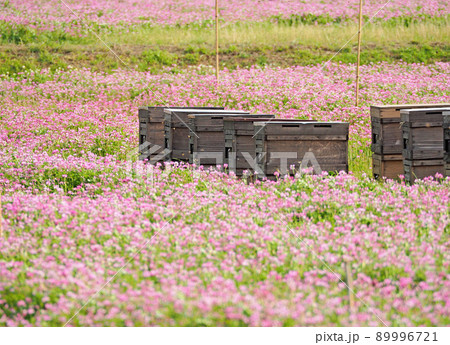 レンゲ畑に蜂の巣箱が並ぶ里山の光景