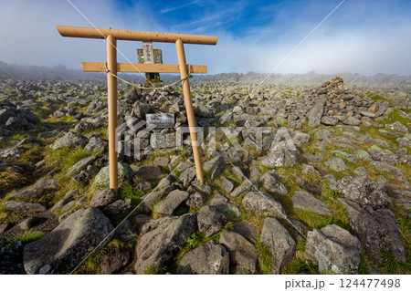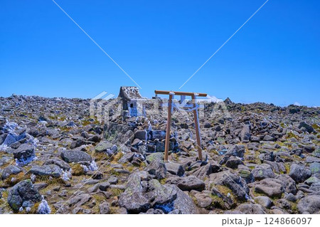 春の長野県 蓼科山の岩だらけの山頂にある蓼科神社奥宮