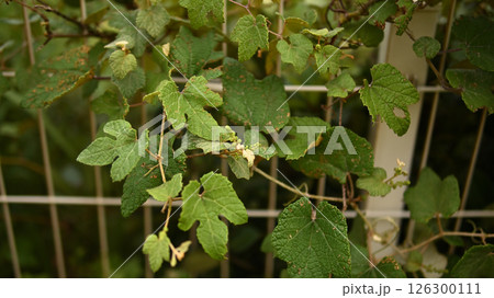 白い壁に固着する蔦のフレーム
