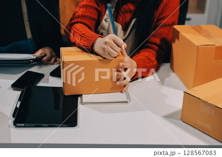 Portrait of Starting small businesses SME owners, two Asian woman check online orders Selling products working with boxs freelance work at home office, sme business online small medium enterprise