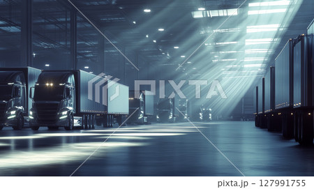 Semi-trucks parked inside cavernous warehouse, dim lighting piercing through overhead beams, casting dramatic shadows across industrial interior