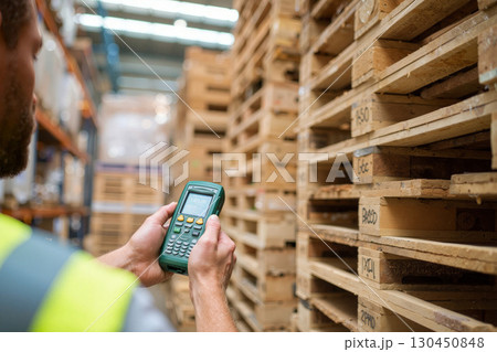Chain manager scans timber pallets with handheld device in warehouse setting during daylight hours