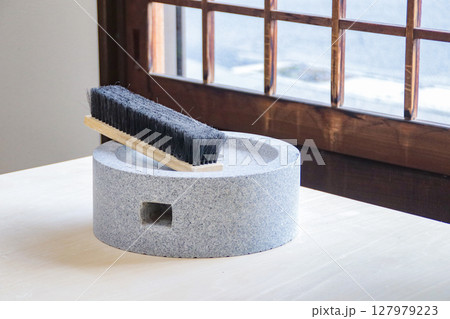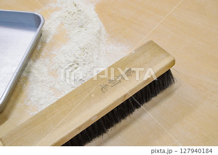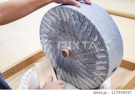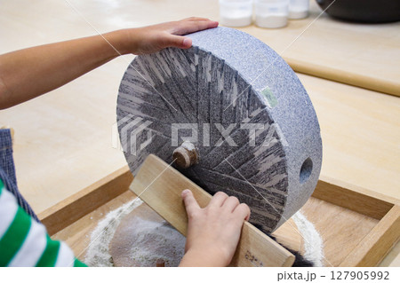 石臼の蕎麦粉を掻き出す子供(7歳児/男の子)