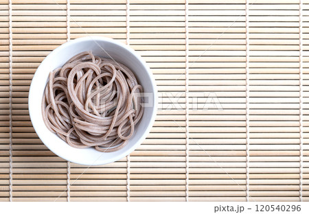 Chilled, boiled soba noodles in a white bowl, placed on a bamboo mat. Thin Japanese noodles, made primarily from buckwheat flour, with wheat flour mixed in. With empty space for text or other content.