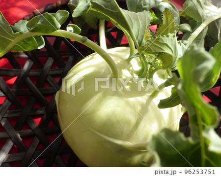 黒色笊に乗せた葉付きコールラビ(蕪甘藍)、一株
