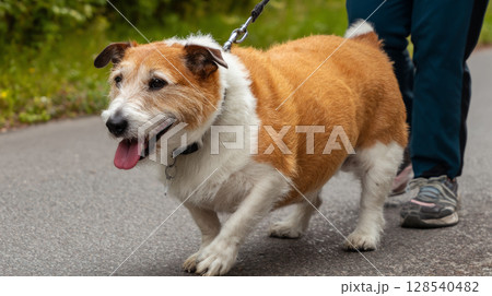 Cute fat dog sad because excess weight. Modern problem of obesity in pets due to overfeeding with food and treats. Concept diet and fight against excess weight in dogs and awareness of animal health