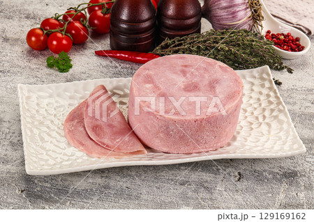 Ham, a meat cooked and sliced for sandwiches or Christmas table. Ham slices