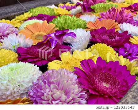 11月の花手水(ガーベラ・菊)クローズアップ〈菅生神社/愛知県岡崎市〉