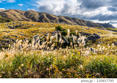 秋晴れの草原にすすきの穂が美しい雄大な阿蘇くじゅう国立公園