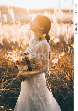 夕暮れの自然の中でランタンを持って佇む女性の写真