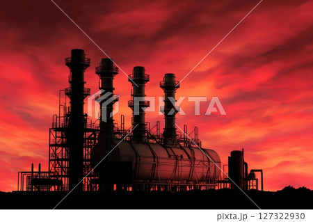 Silhouette of Combined Cycle Power Plant at Dusk with Dramatic Red and Orange Clouds in the Sky